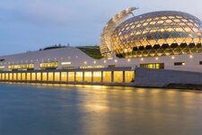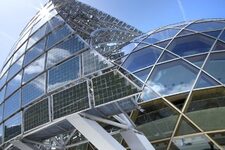 FIgure de proue du batiment, l'auditorium prend la forme de nid et se compose de panneaux photovoltaïques qui se déplacent suivant la course du soleil.